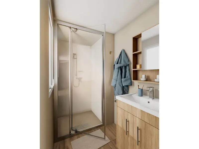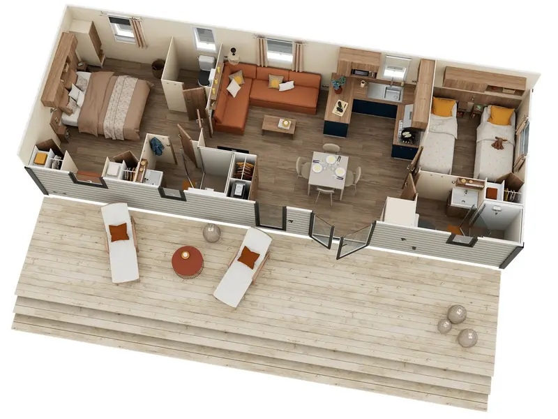De Jasmin is voorzien van 2 slaapkamers en 2 badkamers, waarvan 1 badkamer ensuite! Dit model heeft een zeer lichte leefruimte, waar u geniet op de royale zitbank. De extra ruime ouderslaapkamer is voorzien van een basdkamer ensuite en een zee aan kastruimte. u loopt met gemak om uw bed heen.