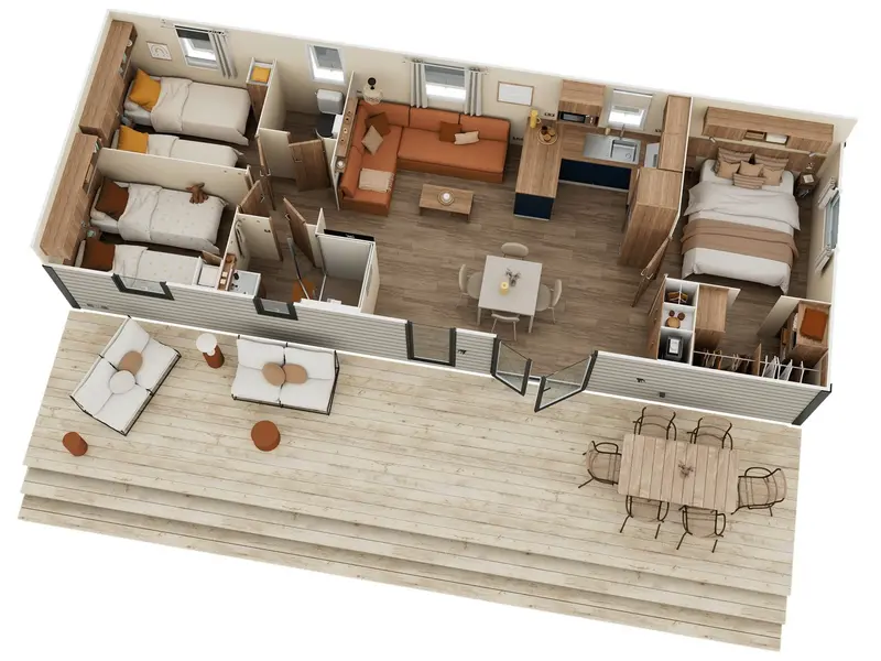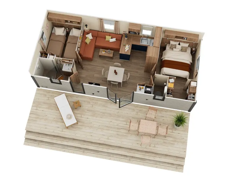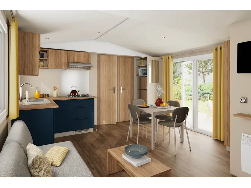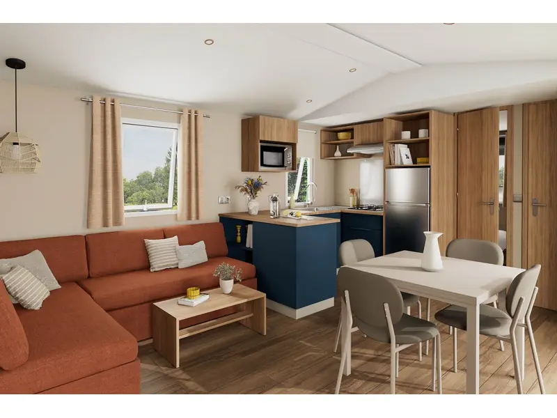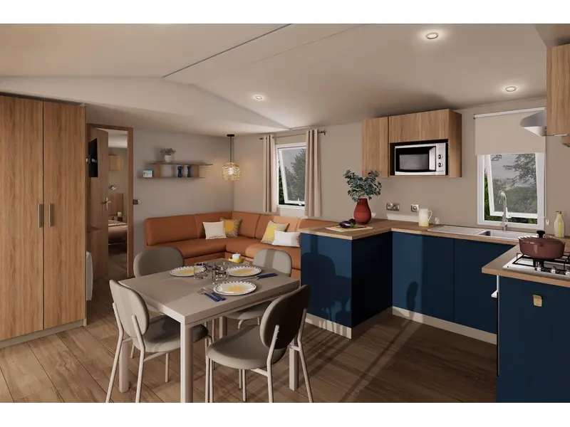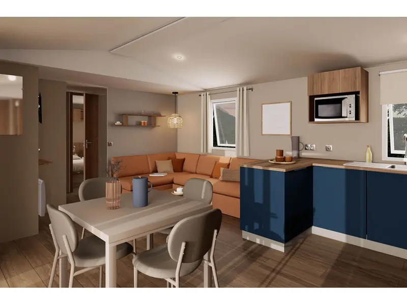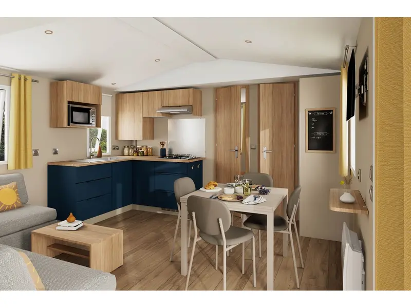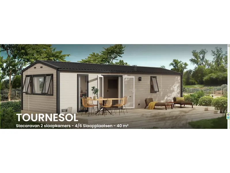 Tournnesol is meer dan alleen een naam, het is een belofte die deze luxe chalet met mooi woonoppervlak moeiteloos nakomt. Dit chalet kenmerkt ziht door het zeer hoge niveau van comfort, de grote raampartij en de openslaande deuren. Dit model heeft de woonkamer aan de voorzijde van het chalet. In de riante U keuken staat u direct in contact met de woonkamer.