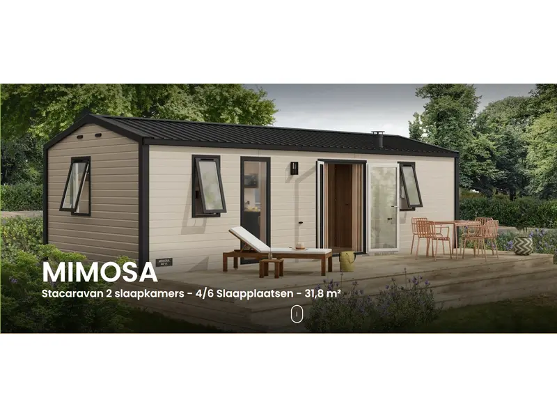 Een heerlijk chalet voorzien van een middenkamer. Geschikt voor gezinnen en families! De Mimosa is een model met ongeëvenaarde mogelijkheden. De ouderslaapkamer is voorzien van een walk in closet. Dit is toch een droom? De Mimosa is voorzien van 2 slaapkamers, badkamer en apart toilet. Op de ruime hoekbank is er genoeg plek om comfortabel te zitten. De u-keuken zorgt voor extra comfort en werkruimte in de keuken.