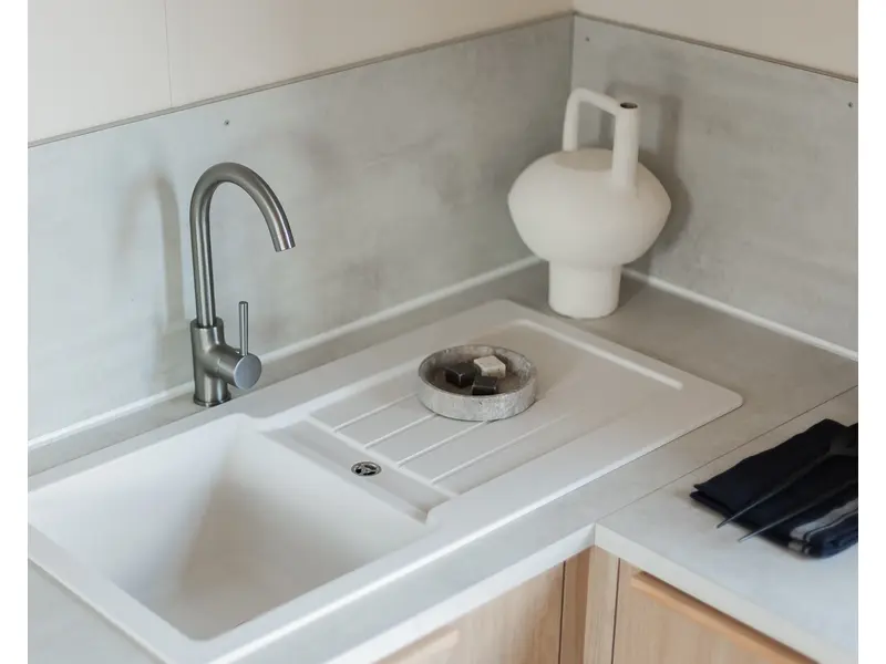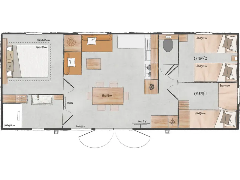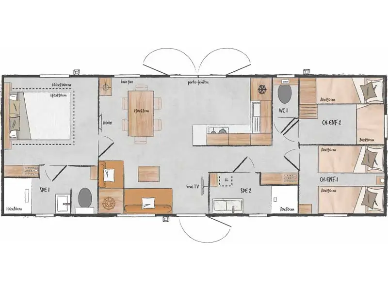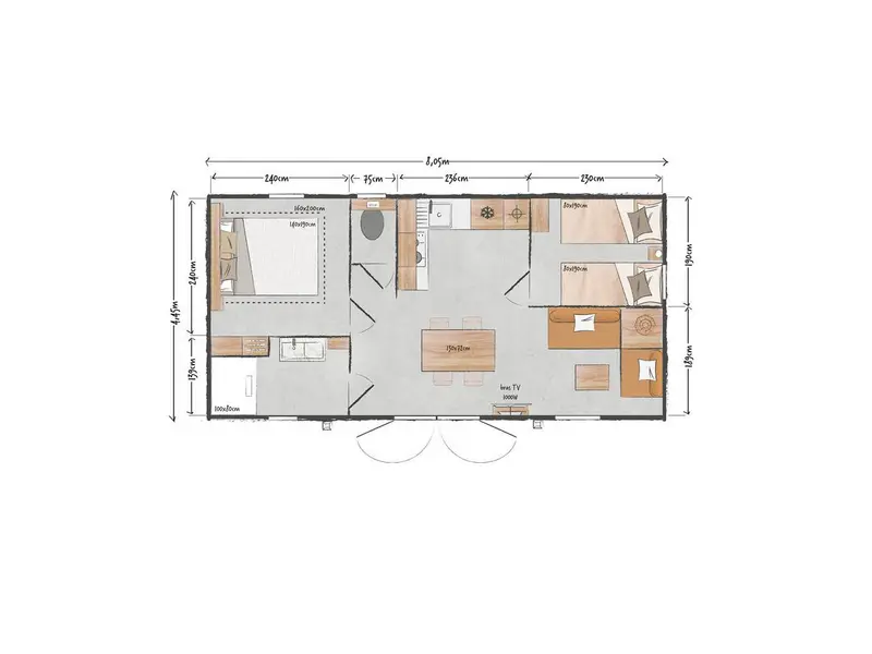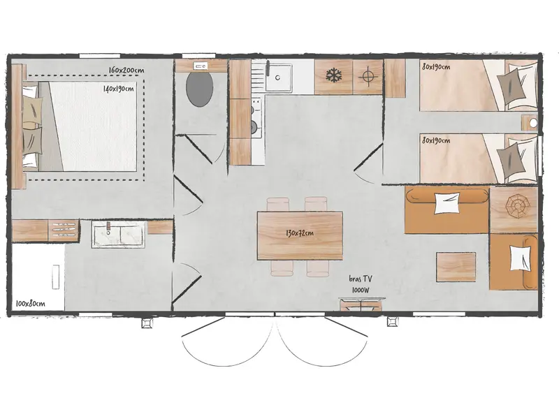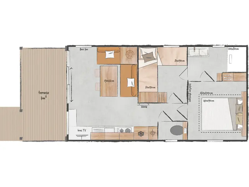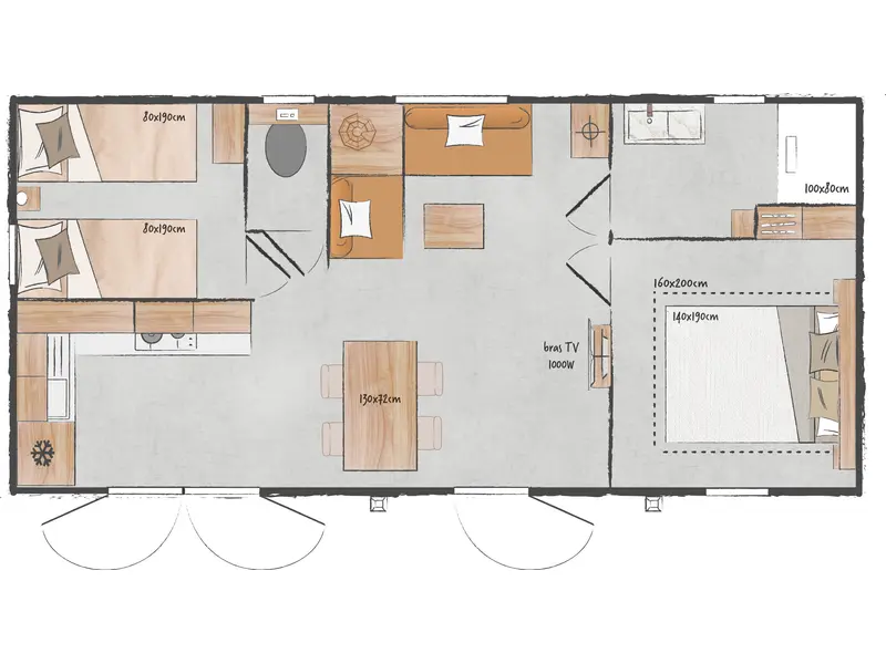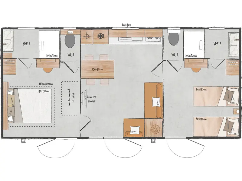 Licht! De 844 2sk is bijzonder licht dankzij brede puien aan de voorkant en naar het terras gerichte zomerkeuken. De EASY CLEAN-badkamer met douche 100x80 is ideaal voor het comfort van de vakantiegangers. Dankzij het oppervlak is de 844 2sk geschikt voor alle percelen!