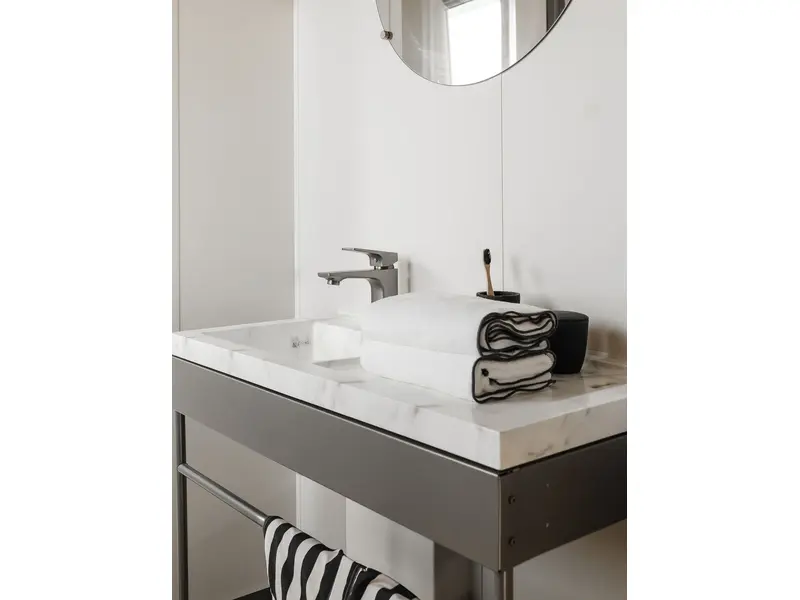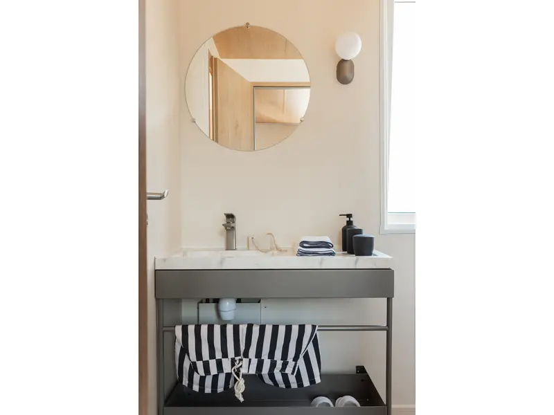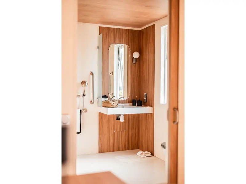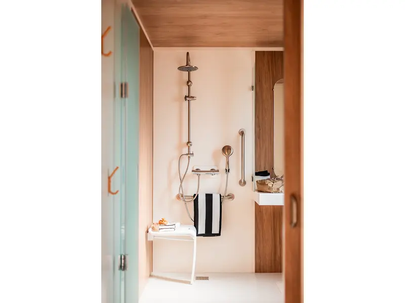 Sterke punten: XXL-site ontworpen in samenwerking met FNHPA en het Passerelles-netwerk, toegang tot alle aangepaste kamers via schuifdeuren met een vrije doorgang van minimaal 83 cm, draaigebieden met een diameter van 150 cm, inloopdouche met volledige ABS-vloer, rlektrische fittingen, handgrepen en accessoires in contrasterende kleuren voor eenvoudige visuele identificatie, aangepaste hoogte van de apparatuur en toestellen