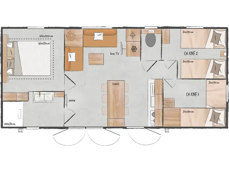 Ongeëvenaard! De 884 3sk is het model met 3 slaapkamers, veel comfort en heel licht. Het heeft een keuken en-suite met directe toegang tot het terras. U zult de gezellige hoge tafel voor het gebruiken of bereiden van de maaltijd zeker waarderen.