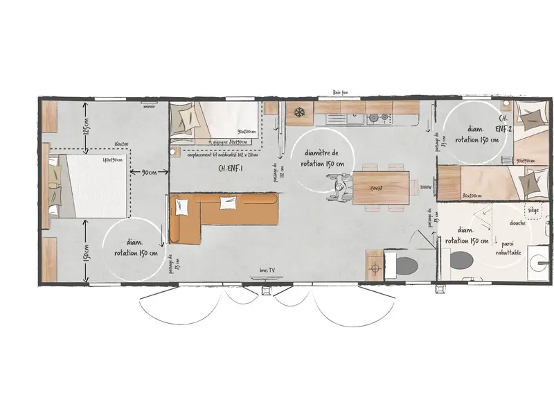 Een ongekend oppervlak voor de gloednieuwe 1175 3K stacaravan! O'Hara verlegt de grenzen met een XXL-indeling van 50 m², ontworpen voor mensen met beperkte mobiliteit. XXL doucheruimte. XXL draaigebieden. XXL openingen van 83cm. XXL ouderslaapkamer. XXL comfort op maat.