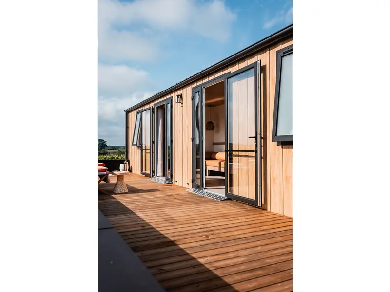 De driedelige schuifpui in de achtergevel tilt deze accommodatie naar een hoger plan door de natuur en de zon op elk moment van de dag in huis te halen.
